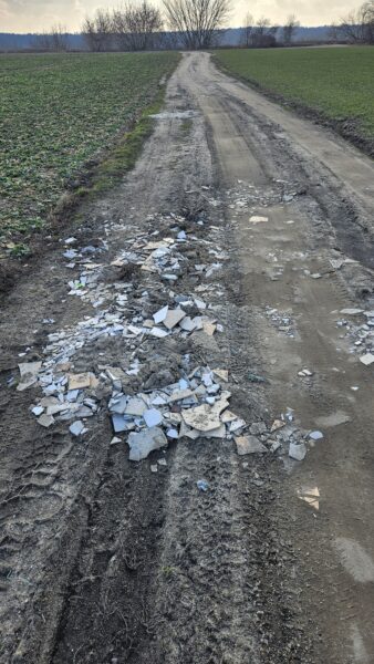 Są tacy, dla których rzadko odwiedzana przez ludzi przestrzeń to okazja, by zorganizować na niej nielegalne składowisko odpadów. W tym przypadku właśnie tak się stało. Pierwszy raz na śmieci natrafiliśmy tu 13 stycznia. Mniej więcej pośrodku drogi między wałem a Wisłą, na wysokości skupiska drzew. Nieco ponad miesiąc później, 22 lutego, śmieci widzimy znacznie więcej. Meble, drzwi, opony, kartony, styropian, odpady budowlane, w tym eternit. Wcześniej były pozostawione tak, by z wysokości wału nie było ich widać. Aktualnie odpady budowlane – cegły, betonowe bloczki – rozrzucono po drodze.